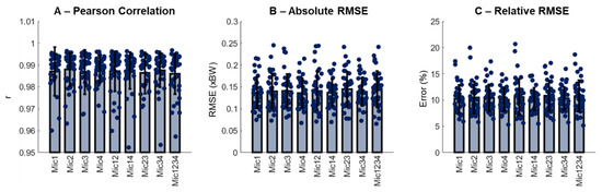 Subjects 1, 4, 5, 7, 9, 11 and 26 had faults in the form of white noise transmissions on one or more microphones and were, therefore, excluded from the study, leaving 37 subjects in the data set. The average running speed was 2.75 ± 0.33 m/s, calculated from 1780 running cycles (48 ± 8 cycles/runner). The final sample size for the investigation was in accordance with recent recommendations of adequate sample sizes for research experiments involving running biomechanics [18]. Each of the 1780 running cycles generated nine different microphone combinations, resulting in a total of 16,020 samples to be predicted. To summarize, the results from each runner, the inter-trial data, were averaged. In general, the quality of the generated vGRF curves across all the microphone combinations was high, with Pearson correlation coefficients exceeding 0.95 with a mean of 0.99 (Figure 3A), absolute RMSE below 0.25 xBW (Figure 3B) and relative RMSE between 5% and 25% (Figure 3C). There were no effects of the microphone combinations neither on the absolute nor relative RMSE (p > 0.05).