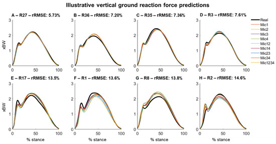 The vGRF predictions using different combinations of the microphones presented predominantly similar outcomes. Figure 4 illustrates the comparison of the real and reconstructed vGRF across the participants with a high-quality prediction (Figure 4A–D) and lower prediction quality (Figure 4E–H).