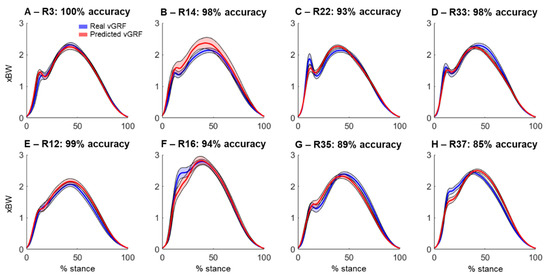 Real (blue) and predicted (red) vertical ground reaction forces (vGRF) from selected runners (R) presenting prominent impact peaks (A–D) and with absent impact peaks (E–H). Thick lines represent data average and shaded areas represent standard deviation. For each runner, the overall accuracy in determining presence/absence of impact peaks is shown in the figure subplot titles.