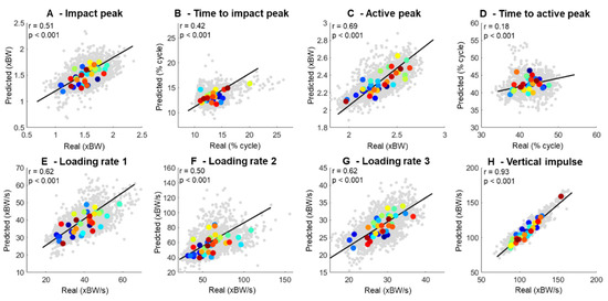 Pearson correlations were conducted to associate the real and predicted biomechanical variables extracted from the vGRF curves independently. The correlations included data from each footstep of each runner for every biomechanical variable shown in Figure 6, where the gray dots represent individual data points, and the colored dots represent the average of a given participant. There were predominantly moderate-to-strongly significant associations between the real and predicted vGRF across the relevant biomechanical variables (Figure 6). The best-fitted biomechanical variables were the vertical impulse (r = 0.93, Figure 6B) and the active peak (r = 0.69, Figure 6E), whereas the time to active peak (r = 0.18, Figure 6D) and time to impact peak (Figure 6B) presented the weakest associations. Moreover, LR-1 and LR-3 presented greater correlation between the real and predicted calculations (r = 0.62) when compared to LR-2 (r = 0.50).