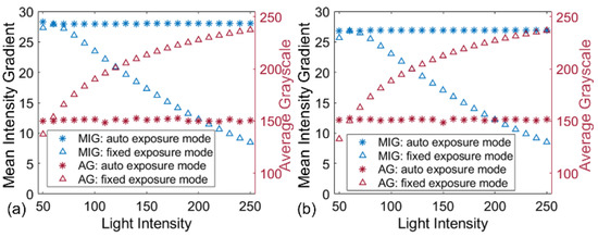 The calculated parameters (MIG and AG values) of the images captured with auto and fixed exposure modes by (a) left camera and (b) right camera.