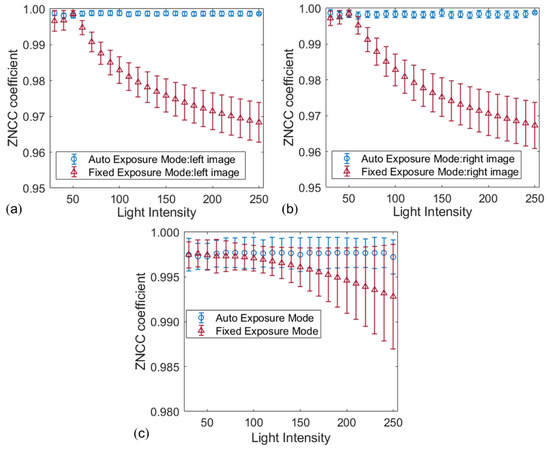 The two groups of image pairs are further analyzed with temporal and stereo matching to verify the effect of image quality on correlation matching. As for temporal matching, the points within the region of interest (ROI, size: 1900 × 1700 pixels) of the reference image are matched to the deformed images belonging to the same camera. During the stereo matching, points within the ROI of the left image match with points of the right image recorded synchronously. To guarantee a reliable matching, the given point in the centre of the square subset is tracked between any two images using the ZNSSD [17] criterion and the advanced inverse compositional Gauss–Newton (IC-GN) algorithm [18]. For quantitative comparison, results are evaluated with the mean ZNCC coefficients [17], as shown in Figure 7. It is obvious that the images captured by the auto exposure mode perform more excellent temporal matching than the other ones. The average ZNCC coefficients obtained by the first group of image pairs keep the stable and very close to perfect matching, with a very small and stable standard deviation (SD) of less than 0.001. By contrast, despite the ZNCC correlation criterion being robust against ambient light variations, the SD of the calculated ZNCC coefficients obtained by the image pairs captured by the fixed exposure mode increase with the increment of the illumination intensity due to the remarkable difference from the reference images, in which the maximum SD reached 0.01. Furthermore, the results of stereo matching obtained by images captured with the auto exposure mode at different ambient light intensities are better than those obtained by images captured with the fixed exposure mode, as shown in Figure 7c.