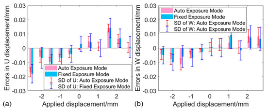 To demonstrate the accuracy of deformation measurement when using the proposed method, in-plane and out-of-plane translation tests were performed with the planar sample at the light intensity of 250 level. The planar sample was translated first along the X-axis and then along the Z-axis from −2.5 mm to 2.5 mm with an increment of 0.5 mm using a three-axis translation stage. For comparison, the translated image pair was recorded at each position with auto and fixed exposure modes, respectively. Then displacement errors were evaluated with the calculated U/W displacement and the imposed displacements. Figure 8a shows the errors and the SDs of the calculated U displacements. The mean errors and SDs computed by the images captured with auto exposure mode are less than one-half of those computed by the images captured with fixed exposure mode. Moreover, it is easy to see a similar result in the out-of-plane translation test along the z-direction, as shown in Figure 8b. This confirms that accuracy-enhanced displacement measurement can be obtained with high-quality images.