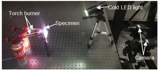 We also explored the practicality of the proposed method in real high-temperature tests, in which thermal deformation measurement of a nickel-based alloy (GH4169) specimen (size: 50 mm × 50 mm × 3 mm) was conducted. As shown in Figure 9, the imaging device was the same as the stereo-DIC system used in the above tests. One cold LED light was used for illumination, and two torch burners were used to heat the specimen. Before the heating, the specimen decorated with high-temperature resisted speckle pattern was placed on the fixture platform about 600 mm away from the imaging device. In the reference state, the apertures of the two lenses were carefully adjusted to reduce the intensity difference between the left and right images. Then the internal and external parameters of the two cameras were calibrated at the exposure time of 500 ms. Before the thermal loading, the optimal reference image pair was recorded using the proposed automatic camera exposure time control method at 25 °C. In performing this, the maximum MIG value of the left image reached 15.45 at the exposure time of 505 ms, and that of the right image was found as 19.65 at the exposure time of 500 ms. Based on the obtained optimal AG values (gopt_L = 159, gopt_R = 157) of left and right images, the ideal AG value was determined gopt = 158 and the initial optimal exposure time for the high-temperature test was set as topt = 502 ms for both cameras. This optimal exposure time topt was adopted as the default exposure time, and the optimal reference image pair was recorded with this exposure time. Subsequently, the cameras recorded the surface speckle image pairs using auto exposure mode and fixed exposure mode (i.e., 502 ms), respectively, at the temperature of 100 °C, 200 °C, 300 °C, 400 °C, 500 °C, 600 °C, 700 °C, and 800 °C.
