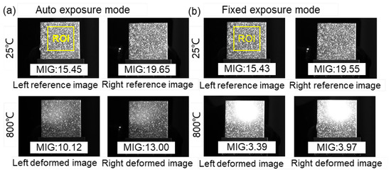 Figure 10 shows the reference (25 °C) and deformed (800 °C) image pairs captured by these two different exposure modes. For the reference images, the MIG values of the images captured by the same camera are close in the two groups due to the same exposure time. Nevertheless, a distinct difference can be found in the deformed images captured at 800 °C. It is seen that considerable saturated pixels appear in the images captured by the fixed exposure mode, while the images recorded using the auto exposure time mode present relatively good contrast. Although all the images at 800 °C were affected by the elevated temperature, the speckle pattern recorded by the auto exposure mode is clearly visible.