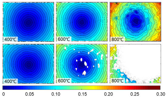 The estimated radial displacement by the image pairs captured with two different exposure modes (top: auto exposure mode; bottom: fixed exposure mode) at 400 °C, 600 °C, and 800 °C.