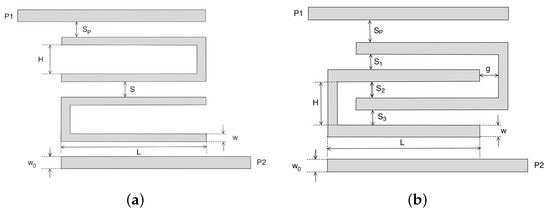 The hairpin model is one of the most used microstrip filters, and it is obtained by folding half-wavelength microstrip lines into a U shape. This strongly reduces the dimension of resonating elements, but at the same time, the U shape slightly reduces the quality factor Q of the resonator itself [20]. The hairpin filter was obtained by cascading different U-shaped resonators, and it was characterized by a bandpass behavior. Its geometrical parameters are reported in Figure 1a. The first task was estimating the width of U-shape resonators w and of the feeding lines . They could be easily estimated by the well-known Hammerstad formula [47] by imposing a microstrip impedance for the feeding lines and the U-shaped resonators. The length L and the height H of the U-shaped resonators are reported in the following relations (1) and (2):
