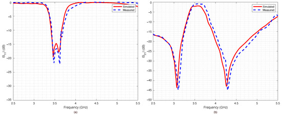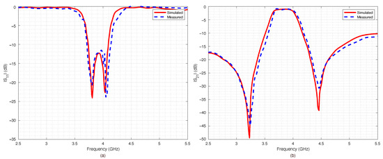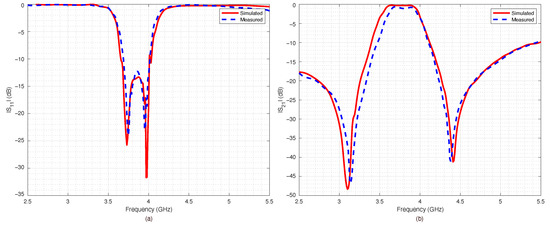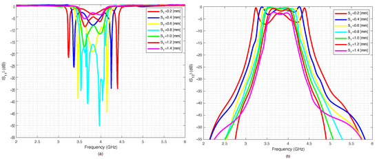 A parametric analysis was carried out to show the effects of geometrical parameters and . The data were simulated with Advance Design System (ADS) software from Keysight company. The effects of gap between the U-shaped resonators on the scattering parameters were analyzed and are reported in Figure 2a,b. In particular, the return loss is reported in Figure 2a and the insertion loss in Figure 2b. The parameter was varied with steps of mm, starting from mm up to mm. Figure 3a,b report the scattering parameters versus the gap between the U resonators and the feeding microstrip lines. As it can be noticed, while the effects of the coupling gap g were negligible, the parameter determined the external quality factor (insertion loss) of the filter so that the insertion loss of the device could be further reduced by increasing this gap. The above parametric analysis provided the initial values and limits for optimizing the geometrical parameters obtained with the ADS optimization tools.