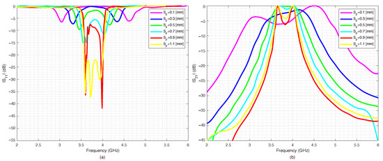 Pseudo hairpin filters scattering parameters versus geometrical parameter: (a) , (b) .
