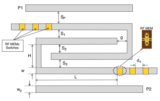 In the last years, there has been a growing evolution in communication systems. The conventional delivery methods, namely, satellite broadcast, radio relays, and cables, have been using analog transmission for many years, and recently, they have been undergoing a revolutionary change to digital broadcasting. Many countries worldwide are already using digital broadcasting by satellite. These revolutions have increased the bandwidth requirements and have led to higher microwave frequency bands and an increased demand for small-size, high-performance, and low-cost microwave devices and systems. Another important characteristic of modern telecommunications systems is their capability to reconfigure themselves to adapt to a new standard. A typical example of reconfigurable systems is the so-called software-defined radio (SDR) [1,2]. Filters play a key role in such a scenario since they are fundamental in almost all communication systems. Conventional filter design methods and circuitry are well documented in the literature [3,4]. However, the new requirements of microwave filters, in terms of efficiency, bandwidth requirements, compactness, power consumption, reconfigurability, and cost, are meeting new exciting challenges in realizing unprecedented demands and new applications [5,6]. In particular, filtering technology is still focusing on reconfiguring itself to different scenarios keeping high-performance requirements, smaller size, and a lower cost [7,8,9]. Due to the low cost and easy fabrication techniques, planar microstrip filters are preferred. Several types of planar microstrip resonator filters [10], such as resonators filters, open loop resonators filters, and stepped impedance resonator filters have been proposed and successfully used for different applications [11,12,13,14]. However, reconfigurability in RF or microwave systems is a top trend, especially in today’s market. For reusability, the same RF front end then dynamically reconfigured its mode of operation according to the application’s demand and standards. In particular, electronically controlled reconfigurable bandpass filters are essential in future multistandard, multifunction wireless communication systems due to their capability to work on different frequency bands and compactness. Hence, reconfigurable bandpass filters can accommodate various bandwidth requirements of different standards, reducing costs and adapting to regulatory changes [15,16,17,18]. Filters characteristics and bandwidth can be modified by changing the inter-resonator couplings. This method is easily implemented in filters based on coupled lines, where the coupling between the elements depends only on the distance and lengths of the overlapping sections. In particular, the length of coupling sections can easily be changed by using electronic switching devices. Because of their compactness [19,20], hairpin bandpass filters are preferred for coupled lines filters. Hairpin bandpass filters are a folded version of a half-wave parallel-coupled filter. In particular, hairpin filters are derived starting from a parallel-coupled filter and folding the ends of resonators back into a “U” shape; this trick significantly reduces the resonator’s size and the resonator’s quality factor Q [21]. Similarly to coupled line filters, hairpin structures can be tuned by varying the length of the resonators by adding a segment of microstrip lines using suitable electronic switches since electronic switches require driving circuitry that can degrade the Q-factor of the filter’s elements. PIN diodes have also been widely used as electronic switches to develop reconfigurable filters. However, they are not the best solution since they require high currents to operate correctly, and the driving circuitry can strongly reduce the quality factor Q. Some attempts to create reconfigurable filters based on PIN diode switches are reported in [22,23]. Other researchers have used varactors to change the filter characteristics [24]. In recent years, many practical engineering applications have used RF-MEMS and obtained outstanding performance [25,26]. In [27,28,29], preliminary attempts to fabricate reconfigurable hairpin filters are reported, while in [30,31,32,33,34,35], different reconfigurable microwave devices are reported. In Table 1, we have compared the hairpin filter technology with our proposed hairpin filter. In the comparison, our proposed work stands out in many parameters such as center frequency, insertion loss (dB), and compact size of filter. It can be noticed in Table 1 that most of the previous hairpin filters which provided a good insertion loss (dB) worked on a higher frequency and had a larger filter size compared to our proposed work. Previous work did not provide filter reconfigurability except the work in [29]. However, the filter in [29] operated on a different center frequency and the dielectric material was quartz. RF-MEMS are very useful for wireless sensors [36] and reconfigurable antennas [37]. RF-MEMS show very good performance in switching speed (usually ranging from fractions of s [38] to 300 s [39]), scattering parameters, and power consumption (aside from leakage currents in the order of dozens of A, electrostatically actuated RF-MEMS switches present a virtually zero power consumption [40]), and they have been demonstrated to work properly up to 90 GHz [41].