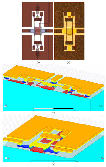 The first mask consisted of a polysilicon layer composing the central buried electrode (in pink in Figure 5a) and the serpentine-shaped resistors connecting the movable membrane to the ground planes of the CPW, and the ones laying under the anchoring points of the metallic bridge. The former was meant to keep the membrane to a null voltage while preventing the RF signal from flowing toward the ground. The latter were meant to extend the device’s reliability by acting as microheaters and restoring the membrane to the rest position in case of stiction. Stiction is the missed release of the membrane when the voltage of the buried electrode is set to zero. As described in [53], when stiction occurs (because of microweldings or a trapped charge within the oxide), the voltage applied to the two pads implies a flow of current along the resistor, which results in a thermal expansion of the locked membrane and an induced restoring force. The third mask consisted of a multimetal layer based on aluminum composing the buried sections of the RF signal line (in blue in Figure 5a), ending in correspondence of two contact pads laying on the surface of the silicon oxide, which was made by evaporating gold (fifth mask). The electrical connection between the two interrupted sections of the signal line was provided by the actuation of the suspended membrane, which was deployed onto a photoresist sacrificial layer (sixth mask). Two layers of electroplated gold (seventh and eighth masks) comprised the CPW frame and the movable membrane (in brown in Figure 5a), characterized by a simple design: a central transducer with four slender beams leaning against the two anchoring points.
