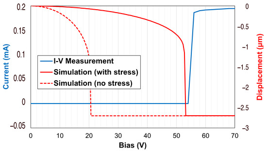 Regarding the electromechanical features of the discussed switch, the following considerations were based on the comparison between the simulated and the measured curves reported in Figure 6. While the simulations were performed in the Ansys Workbench environment, the experimental I–V measurements report the amount of current flowing from input to output ports along the RF signal line against the bias voltage applied to the electrode. As visible in Figure 6, on the one hand, the nominal actuation (pull-in) of the membrane should take place at 21 V, the amount of voltage at which the membrane would reach its maximum displacement (2.5 m). On the other hand, the reported measure shows that the current along the RF signal line became non-negligible (due to the pulled-in membrane) only for voltage levels greater than 56 V. The significant discrepancy between the simulated and the measured behavior was caused by the residual stress within the gold layers composing the movable bridge. As reported in more specific works [54,55], the residual stress within thin films is the result of different contributions: the juxtaposition of layers with different amounts of internal stress and the thermal treatments performed during the fabrication, with the latter being the most predominant (and fortunately, controllable). For example, during the sacrificial layer removal, the temperatures and the duration of the operation induce stress which may be of a tensile or compressive type, and it may have a uniform or a gradient distribution along the thickness of layers. In the case of structures of clamped–clamped-type, a substantial compressive stress would lead to an out-of-plane deformation (buckling) of the membranes. The amount of residual stress embedded in the movable structures can be determined by measuring the bending of ad hoc test structures on the wafer of fabricated devices utilizing profilometers. The measured deformation is related to a specific amount of residual stress using suitable analytical models [56,57]. In clamped–clamped structures, the presence of a tensile residual stress is not visually evident since the structures usually maintain their planarity, but they are subject to a built-in tension which increases the spring constant of the suspended structure, and thus the amount of voltage required to actuate them. A nearly 100 MPa tensile stress characterized the membranes of this batch of fabricated samples. This led to a general stiffening of the movable bridge and, consequently, to the increased pull-in voltage of 56 V, as visible in Figure 6; by imposing such an initial stress condition to the 3D model [49], it was possible to achieve a simulated behavior with a negligible discrepancy compared to the experimentally measured one.