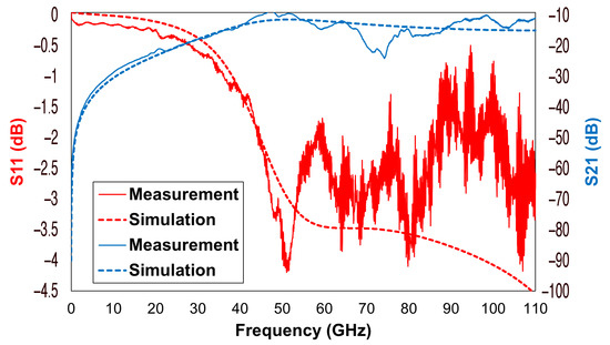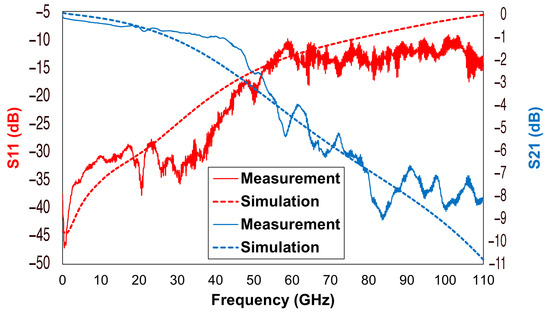 Regarding the reported switch’s electromagnetic (S-parameter) features, the following considerations were based on comparing the simulation results obtained in the Ansys HFSS environment and actual measurements over a 110 GHz frequency interval. Such a broad observation range had a twofold purpose: firstly, to demonstrate the wideband and remarkable characteristics of the employed devices, and secondly, to underline the excellent agreement between the outcomes of the simulation and the measurement approaches. Concerning the on-wafer measurement setup, the reported S-parameters were characterized on a probe station with the Agilent (now Keysight) N5227A PNA (programmable network analyzer) microwave network analyzer, working up to GHz, with a frequency up-conversion system up to GHz, and ground–signal–ground (GSG) probes (m pitch). We delivered dBm and the setup was calibrated with the line–reflect–reflect–match (LRRM) method up to GHz. The LRRM calibration was repeated twice since the measurement was performed in two frequency ranges, from MHz to GHz, and from GHz to GHz. The reason behind the ripples (visible in some of the curves beyond GHz) could be various, from the wear of the probes to nonidealities introduced by cables and/or connectors, or the calibration method itself. However, it is essential to notice the qualitative agreement between the two kinds of reported curves.