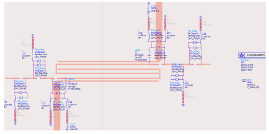 ADS schema of the reconfigurable interdigitated pseudohairpin filter based on PIN diodes.