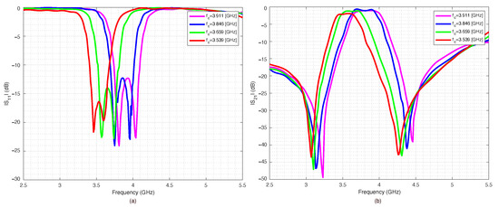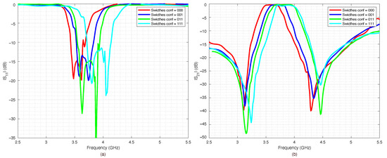 The filter capabilities to reconfigure itself are reported in Figure 18a,b, which summarize the measured scattering parameters for all the considered configurations. As expected, when all the switches were OFF (Figure 14), the results were almost the same as the ones obtained for the PIN diode switch-based filter, reported in Figure 10. However, the filter based on RF-MEMS switches showed excellent performance for all the other switches’ configurations, although the RF-MEMS devices were demonstrated to slightly outperform the PIN diode characteristics in the vicinity of the central frequency . In particular, by comparing Figure 10b and Figure 18b, it is possible to notice that the insertion loss of the MEMS-based prototype in the passband region was better than the one of the PIN-diode-based version for every corresponding state of the reconfigurable filter. The advantage of the proposed prototype became more substantial when considering that the one based on PIN diodes was a simulated implementation. As can be seen in Figure 14, Figure 15, Figure 16 and Figure 17, despite the substantial agreement between measured and simulated curves, the measured S21 curves exhibited some local and limited discrepancies compared to the corresponding simulated S21 curves. More specifically, the measured insertion loss showed a maximum improvement of 1.85 dB (111 configuration reported in Figure 17b), and a maximum impairment of 0.4 dB (001 configuration reported in Figure 15b) compared to the simulated insertion loss. Such an interval of discrepancy would reasonably also characterize a possible comparison between the simulated and a fabricated prototype version of the proposed reconfigurable filter based on PIN diodes. For these reasons, a potential comparison between a prototype based on PIN diodes and the proposed one would more markedly highlight the advantages of this realization both in terms of return and insertion loss. In fact, as visible in Table 4, the results in terms of central frequency , bandwidth , and return and insertion loss were generally better than the data reported in Table 2, while in some cases they were comparable, with a deviation less than .