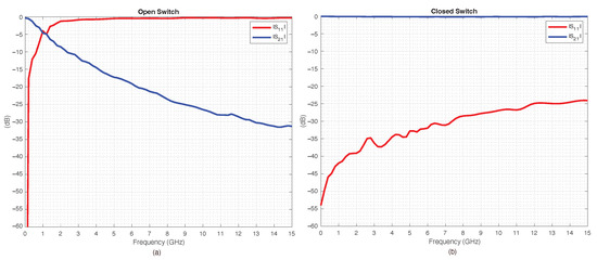 To provide a more distinct idea regarding the performance of the discussed RF-MEMS switches in the vicinity of the center frequency , Figure 11a,b report the measured scattering parameters along a narrower frequency range, up to 15 GHz. In particular, Figure 11a,b report the return and the insertion loss of an RF-MEMS switch in OPEN and CLOSE states, respectively. As can be noticed from the data, the RF-MEMS performance, in terms of scattering parameters, was excellent. For the sake of comparison, a single RF-MEMS switch was evaluated at the center frequency and compared with a PIN diode switch, and their measured scattering characteristics are listed in Table 3. For evaluation, each switch was connected to its respective driving circuit: a bias network for the PIN diode and a DC–DC step-up converter for the RF-MEMS device. The switches were measured with a VNA and provided a suitable bias-T to prevent damage.
