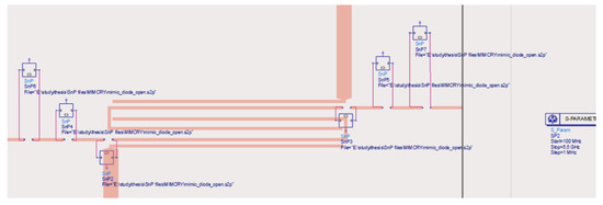 Given the data reported in Table 3, it can be observed that the MEMS-based switch slightly outperformed the PIN diode one; however, it is also worth noticing that the employed RF-MEMS switch kept their good performance up to high frequencies (insertion loss smaller than −1 dB up to 40 GHz), while the considered MACOM PIN diode could not work along such broad intervals. Moreover, the central frequency of GHz characterizing the filter was relatively low to permit comparisons with commercial PIN diode switches. During the preliminary simulation phase, the Touchstone files of the measured scattering parameters of the RF-MEMS switches were integrated into the ADS simulator to obtain realistic simulations, replacing the MACOM PIN diodes and the driving circuitry. The ADS schema of the MEMS-based pseudohairpin reconfigurable filter is reported in Figure 12. The consequent simulation results are discussed in the following subsection in light of the measurements performed on the final prototype.