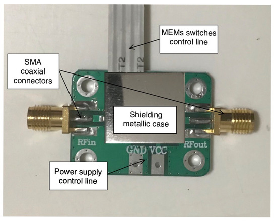 As proof of concept, the MEMS-based filter prototype is described and assessed in this section. The filter structure was fabricated with a computer numeric control (CNC) machine, considering the same dielectric substrate used in the numerical assessment, namely, RT/duroid 5880 ( and mm). Then, the filter structure, RF-MEMS switches, and step-up driving circuits were enclosed in a shielded case to prevent interfering signals and connected to the microcontroller. Figure 13 shows a photo of the filter prototype. The DC–DC step-up converter employed to increase the control voltages from V up to V was a monolithic integrated circuit, namely, the XC9103 from TOREX company.