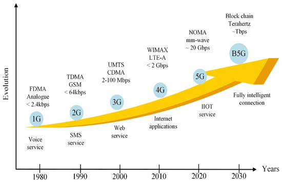 In the last few decades, mobile communication technology has progressed from the audio-centric first generation (1G) to the data-centric recent generations to cater for wide range of applications. In different generation of mobile communication, MA methods permit users to utilise the time and/or spectrum resource simultaneously, and this may be conducted without compromising the users’ quality-of-service (QoS). In Figure 1, MA techniques such as frequency-division multiple access (FDMA), time-division multiple access (TDMA), orthogonal frequency-division multiple access (OFDMA), code-division multiple access (CDMA), and non-orthogonal multiple access (NOMA) show how various users (represented by different line designs) are assigned spectra. The analogue 1G system, for instance, uses FDMA to enable voice communication only [5]. By using FDMA [6], frequency bands are separated into distinct channels and hence the channels are then assigned to different users in 1G. TDMA became increasingly feasible with progress in digital communication systems, and it is used in the second-generation (2G) systems for text and voice applications [7]. In TDMA, each user is authorised to transmit on the same frequency band, but only within a specified time period. The third-generation (3G) systems use CDMA to offer video, voice, and data services [8]. CDMA [6] provides consistent bandwidth and transmit power where users can send data at the same time utilising the same frequency range, employing pseudo-code of sorts. To enable rich multimedia broadband services that desire low latency and high data rates, the fourth-generation (4G) long-term evolution-advanced (LTE-A) [9] was introduced, which uses OFDMA and single-carrier FDMA for downlink and uplink, respectively. In OFDMA [10], MA is achieved by distributing portions of subcarriers to each individual. 4G technologies included carrier aggregation (CA), heterogeneous network (HetNet) deployment, coordinated multi-point (CoMP), improved broadcasting and multi-casting services, and full-dimension multiple-input multiple-output (FD MIMO) [11]. The peak data throughput requirements for LTE-A are 1 Gbps for downlink, with 5 ms latency and a mobility of up to 350 km/h [12]. However, sophisticated albeit important future applications such as tactile communication, augmented and virtual reality, ultra high-definition video quality, and online remote control monitoring are some of the challenging performance objectives. Hence, these aspects generated the need for 5G and B5G systems [13]. The evolution of mobile wireless systems with multiple access technologies is discussed in [14] and depicted in Figure 2. The 5G and B5G technologies are able to provide solutions for different and mission-critical applications, such as massive machine type communication (mMTC) [15], enhanced mobile broadband (eMBB) [16], and ultra-reliability and low latency communication (URLLC) [17], as per International Telecommunication Union (ITU) [18]. The first commercial version of a 5G system based on 3G Partnership Project (3GPP) release has 15 standards. The new generation of networks is likely to have additional improvements to enable advanced services and applications [19].