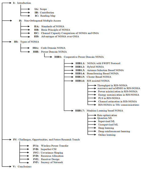 Most studies in the literature have emphasised on code-domain NOMA (CD-NOMA) [21,22,23,24,25], or power-domain NOMA (PD-NOMA) [22,26], albeit without cooperation between users or devices. However, to the best of our knowledge, no comprehensive survey or an overview has taken into account a machine learning-based PD-NOMA, RIS-based PD-NOMA, and transmit antenna selection-based PD-NOMA systems. Hence, the present survey includes a majority of NOMA variants within the broad category of PD-NOMA and cooperative communication in PD-NOMA.