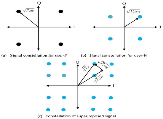 Consider a situation in which represents the total number of users where user-N denotes the near user and user-F represents the far-user. Complex-valued symbols, and for user-N and user-F, respectively, are mapped into their appropriate M-ary modulation constellation with total transmitted power and the power allocation coefficients and for user-N and user-F, respectively. For this example, both users will utilise quadrature phase-shift keying (QPSK), as shown in Figure 4. In SC, user-F’s (higher transmit power) constellation is superimposed on user-N’s (less power) constellation to produce a mapped constellation, as shown in Figure 4c.