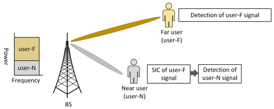 It is commonly accepted, e.g., in [47,48,49,50] that to separate user information, NOMA uses the successive interference cancellation (SIC) method at the receiver’s end. During the SIC process, however, information from users with lower channel gains is extracted by users with higher channel gains.