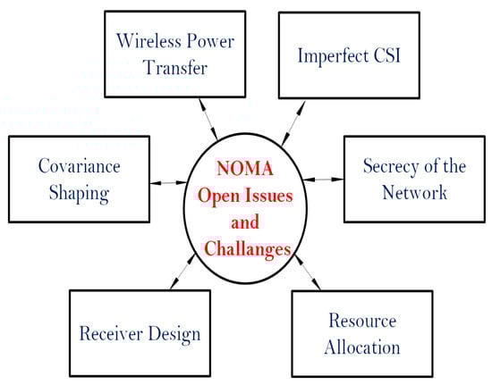 Cooperative relaying NOMA (CR-NOMA): Recent work has investigated the diversity gain in order to make use of the NOMA technique’s existing knowledge [72]. In this approach, a user with good channel conditions decodes other users’ messages and works as a relay to facilitate the weak users (with bad channel conditions) for better reliability of reception. It increases the gain in diversity for all users. Nonetheless, it has been found that during the cooperative phase, when data are transferred using relay towards weak users, extra time slots are required to meet the objective because relaying operations are carried out serially.