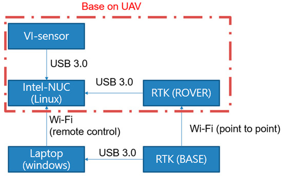 The block diagram of the developed VIO system for UAVs is shown in Figure 4. In the flight tests, a laptop is used to be the ground control station (GCS) for monitoring the flight tests, and the putty software and Wi-Fi are used to be the remote-control interface of the onboard computer (Intel NUC) to collect the data from different sensors, such as the VI-sensor and RTK rover receiver. In the flight tests, RTK data are not feedbacked to the flight control computer. A RTK base station is set up at GCS to transmit the RTK correction data to the rover on the UAV.