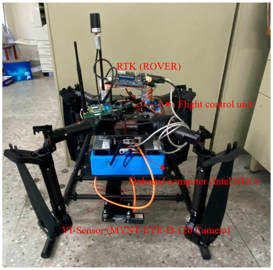 Intel NUC is running with Linux Ubuntu 16.04, and some tools and packages, such as ROS, are installed. The MYNT-EYE-D-120 Camera is selected as the VI-sensor to collect the image and IMU data because it can provide calibrated IMU outputs, and the SDK is available with some VIO algorithms. The image resolution is 2560 × 720, and the frame rate is up to 60 FPS. The sampling rate of calibrated IMU outputs is 200 Hz. The RTK system provides the ground truth for the tests of the proposed landmark-based scale correction of VIO for UAVs. The base station equips a Hemisphere MD Eclipse P328 and the rover a Mindware MD Eclipse P327, enabling the simultaneous tracking of a lot of satellite signals, including GPS, GLONASS, and Galileo, making it the most robust and reliable solution for different applications. After the base station completes the survey, the rover will converge to centimeter level in 30~60 s. The real test results show that the 3D precision achieved an accuracy of 0.01 m, which is defined in one sigma statistical probability. The overall UAV system and its onboard equipment are shown in Figure 5.