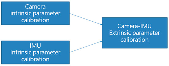 The reliability of ROVIO and the VO algorithm with landmark detection relies on the outputs of the camera and IMU; therefore, accurate data are essential to improve the output quality of the sensors. The proposed scale correction process adopted the calibrated IMU data and outputs of ROVIO and the VO algorithm to improve the position output of ROVIO, and the scale correction does not feedback to the states of the ROVIO algorithm. Therefore, before the flight tests, the adopted sensors, such as the camera and IMU, must be calibrated. The calibration flowchart is shown in Figure 6. The Kalibr visual–inertial calibration toolbox [34] is used to calibrate the camera intrinsic and camera–IMU extrinsic parameters. The imu_utils toolbox [35] is used to estimate IMU extrinsic parameters.