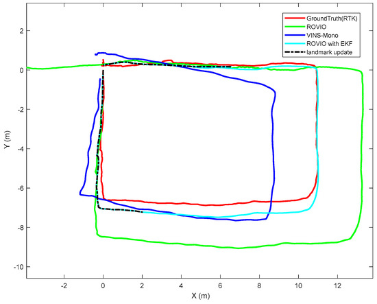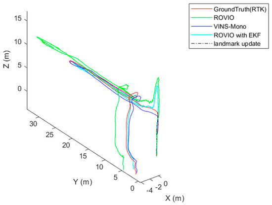 In this study, the EKF can be updated with two measurements, which are the position outputs of ROVIO and the VO algorithm. One is the VO outputs estimated by landmark. The other is the VIO with scale correction after the scale correction is estimated and the landmark is not detected by the VO algorithm. When the UAV is returning to the takeoff location, the trajectory estimated by the landmark is used again to update the scale correction.