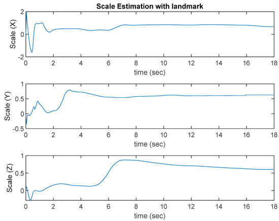 In Case 1, as Figure 11 shows, the VINS-Mono algorithm performs well. The ROVIO algorithm has an obvious scale problem and long-term drift. Moreover, when the UAV moves quickly, the estimated location of the ROVIO algorithm performs the worst, and the overshoot occurs when the UAV takes off. As shown in Figure 11, the proposed VIO algorithm with a landmark update provided an accurate location in the return-to-launch process and performed better than VINS-Mono. Figure 12 shows the results of the scale estimation with a landmark in Case 1.