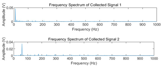 Four groups of experimental data were collected, including 0.6 V, 10 Hz; 0.6 V, 60 Hz; 0.8 V, 5 Hz; and 0.8 V, 60 Hz, denoted as Collected Signal 1, Collected Signal 2, Collected Signal 3, and Collected Signal 4, respectively. The corresponding spectrum analysis of the four groups of collected signals is shown in Figure 7.
