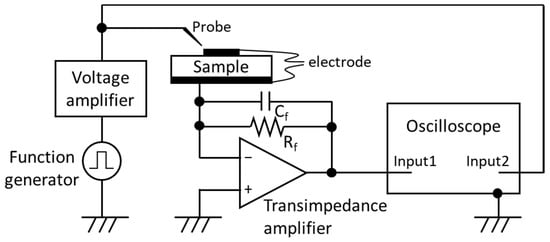 Ferroelectric switching dynamics have been of interest since the emergence of ferroelectric materials [1,2,3,4,5]. Kolmogorov–Avrami–Ishibashi (KAI) and nucleation limited switching (NLS) models have been developed to explain the phenomena based on experimentally measured polarization evolution [2,4]. Switching polarization is quantified by measuring charge flow in external circuits. The classic Sawyer–Tower circuit stores and reads the charge on a reference capacitor, essentially integrating the switching current over time [6]. Camlibel reported a voltage transient attributed to polarization switching across a reference capacitor following voltage pulse application in ms order using the Sawyer–Tower circuit [7]. However, to obtain the switching response in < µs order, a direct measurement of switching current flowing through a circuit is suitable for time-resolved observation of current/polarization dynamics. Measuring the voltage drop across a simple shunt resistor due to the flowing current introduces a tradeoff between measurable signal and circuit load effects, which are particularly problematic for the rapid dynamic change in impedance and the dynamic current range seen in ferroelectric switching [8]. Thus, a transimpedance amplifier is frequently used because its virtual ground avoids circuit load effects across the wide impedance changes inherent to devices such as photodiodes and switching ferroelectrics [9,10,11]. Observation of sample-limited ferroelectric switching behavior requires integration of an appropriate voltage source in addition to time-resolved charge measurement.