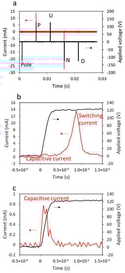 Typical PUND measurement results for the Al0.7Sc0.3N thin film using this instrument are shown in Figure 3. Along with the applied voltage sequence (black line), the current response (red line) is shown in Figure 3a. The significant positive current (14 mA) and negative current (−27 mA) peaks associated with the P and N pulses correspond to polarization reversal (ferroelectric switching) within the sample. The asymmetric responses point to the imprint seen in the P–E loops in Figure 2b and reported previously [14]. Figure 3b,c shows the magnified current and voltage evolution for the P and U pulses. For both pulses, capacitive current is clearly measured during the voltage rise, confirming that the transimpedance amplifier does not limit the current flow during this stage as designed in the Measurement Instrument section. Note that the CR time constant is orders of magnitude faster than the applied voltage rise time due to the pF order of capacitance of the measured devices. A large current peak appears after the capacitive current only for the switching pulses (P and N). This switching current is not disturbed by the external circuit; the current is below the current supply limit (200 mA) of the voltage amplifier, and no voltage drop associated with power shortage at the current peak is seen in the measured applied voltage curve in Figure 3b.
