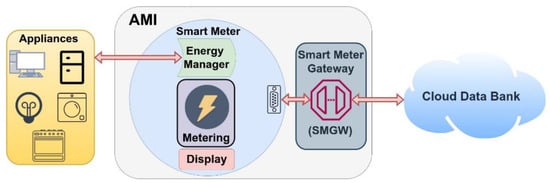 A Smart Grid is a new generation of the conventional electricity infrastructure that is to be a solution to improve the electrical energy system not only by integrating Renewable Energy Resources (RES) but also Distributed Generation (DG) and Distributed Storage (DS). Smart Grid targets to solve different existing problems in power delivery, answer the climate changes, improve energy efficiency and localization of energy exchanges and open a new direction in electricity markets (like Peer-to-Peer P2P energy trading). A direct implication of the Smart Grid is to have an electric model that is capable of managing different generation and storage devices in an efficient and decentralized way by deploying an Advanced Metering Infrastructure (AMI) []. Advanced metering infrastructure (AMI) is a system that meters, collects, controls, and evaluates the energy consumption at the request site and transmits this information to utilities, grid operators, and customers. An AMI system, as presented in Figure 1, consists of the below-listed components.