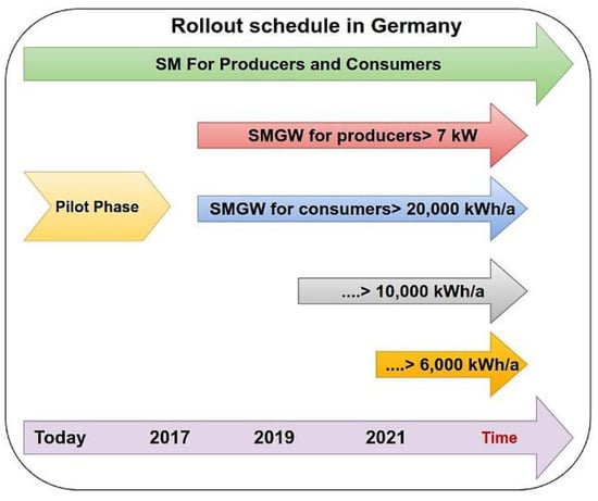 Later on, Smart Meters will be mandatory for installations, and referring to Germany’s Metering Point Operation Law (“Messstellenbetriebsgesetz”, MsbG) [], the deployment of SMGWs continues a strategy of progressive deployment until 2032, making it mandatory at the end for consumers of more than 6000 kWh/year, or users with sustainable feed-in reaching about and exceeding 7 kW peak. However, for users whose consumption remains below these thresholds, the deployment of SMGW is not mandatory. Theoretically, the obligation to install a smart meter also applies to the use of controllable appliances and installations with a power output of more than 7 kW following the Renewable Energy Sources Act (EEG) and the Act on Combined Heat and Power Generation (KWKG) where the possibility of an automatic Smart Meter that measures transmission to external entities and the receipt of load shifting commands from external entities seem promising. Figure 2 shows the SMGW rollout schedule in Germany.