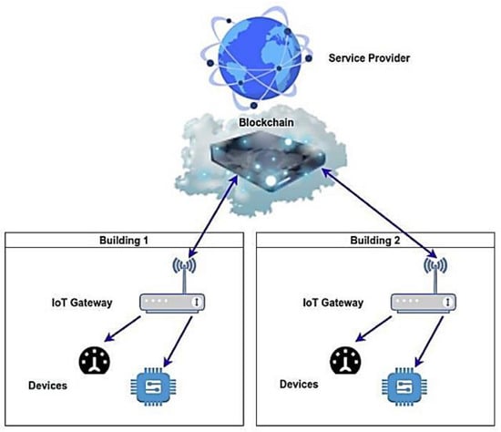 In this section, we focus on the AMI-Blockchain architecture, which is used on smart meters to measure and record the energy usage data of a smart grid. It is a well-known fact that smart meters are connected to networks worldwide to make them more resilient and efficient []. Centralized cloud-based architectures are usually preferred to build IoT networks and validate the data for the sensing devices and the end-users. For the validation procedure, we often need a third-party service provider []. While the number of connected devices increases, network cyber-attacks against power grids, are also increasing []. Network cyber-attacks, where a malicious actor targets the power grid and successfully penetrates security, are happening very often. To avoid cyber-attacks and improve security frameworks, a lot of work and reports have been conducted by computer science to implement smart meters in production []. Smart grids do not have an accurate definition, and we can describe them as a two-way delivery of energy, information that is transparent, seamless, and instantaneous, and enables the electricity industry to manage energy delivery and transmission and to empower consumers to take more control over energy decisions []. They connect heterogeneous variable components like renewable and non-renewable energy sources, controllers, and intelligent sensors with different functionality and requirements []. Smart-grid networks, which are also known as AMI, have changed the electricity grid by adding smart meters []. Blockchain technology has transformed smart-grid applications by increasing decentralization and improving trust. Therefore, this technology, along with Blockchain, is used for smart-grid energy management applications. Despite its rapid growth, its advantages are not too exploited in such applications [,]. Thus, the deployment of new hardware and software applications is needed. In general, a new AMI-Blockchain application may involve different smart devices, like smart lights, smart sensors and switches, and other electric devices that monitor and control various parameters on a building and can be operated independently or coordinated by one or more users. To achieve the objective of the AMI-Blockchain application, the interconnectivity of smart devices is essential. Therefore, an AMI-IoT Gateway is responsible for interoperability challenges between smart devices. Users can control the smart devices as long as the service provider provides necessary recommendations for controlling smart devices based on prediction algorithms. The Blockchain network is responsible for the connection between different users and service providers to enhance security in the AMI-Blockchain application. The general architecture of AMI-Blockchain is shown in Figure 3.