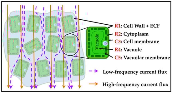 At high frequencies, since imaginary and real components are small, the membrane impedance approaches zero (Figure 9), and the membrane acts as a short circuit. Then, the electric field passes easily through both the ECF and ICF. The plant cell membrane acts electrically like a capacitor, with a capacitance that fluctuates with frequency [29]. The presence of dielectric material in the capacitor increases the capacitance value, as suggested by Juansah et al. [61].