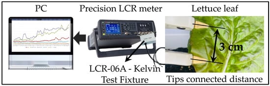 - The designed experiment process was as follows. Open-circuit calibration and short-circuit calibration were performed before measurements to calibrate the LCR equipment. Using a pair of electrodes adhered to the lettuce leaves, the impedance of the leaves was measured without harming the plants. Throughout all measurement periods, the two electrodes were kept 3 cm apart. After the measurement, the electrodes were washed, dried, and placed on new leaves to prevent unreliable results.