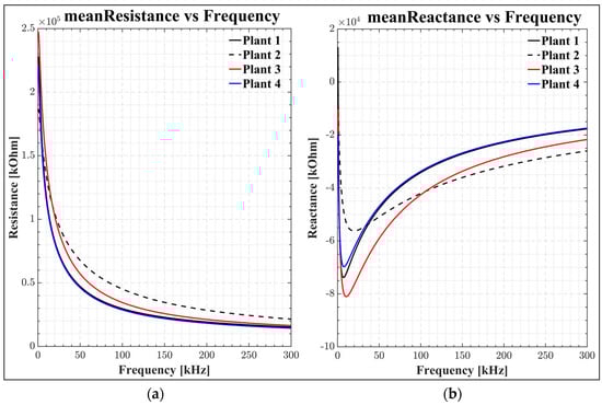 (a) Frequency-dependent resistance; (b) frequency-dependent reactance graphs, where is the measured resistance, and is the measured reactance for various plants (plants 1 to 4) with an average try as a function of frequency.