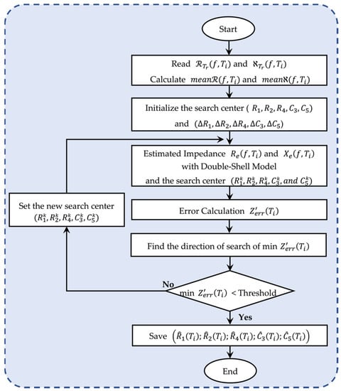 From the starting search-center points ( obtained after interpolation, a search direction was defined , and was minimized in that direction. When the minimum-error impedance condition is not satisfied, new search candidates are set (), as shown in Equations (7)–(11) below. The search direction is followed by another line of searching. It can be carried out with various degrees of precision. A simple successive doubling of the step size is used as a screening method until reaching an optimal step length value from 0.1 (10%) to 0.001 (0.1%). At this point, the screening search can be terminated, and a sophisticated method was employed to yield a higher degree of accuracy. The step length was set to 0.001 (0.1%) as the minimum step size for the results to be accurate. The search points were updated in a calculation loop, and the estimated curve converged more and more closely to the measured curve until the condition was satisfied ().