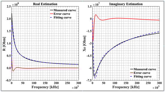 Figure 9 shows an example of optimization results for one plant measured at one hour, corresponding to plant 1 at 8 a.m. This figure presents a real estimation and an imaginary estimation plotted as a function of frequency. The measurement curve (experiment), fitting curve (curve fit), and error curve have been potted for both real and imaginary graphs.