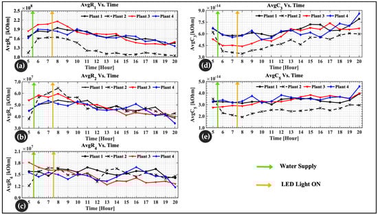 The results of the optimization algorithm were plotted in groups of each parameter for all four plants as a function of time. These parameters were the cell wall and ECF resistance (R1), the cytoplasmic resistance (R2), the vacuole resistance (R4), the cell membrane capacitance (C3), and the vacuolar membrane capacitance (C5). Figure 10 shows the average of the internal changes in lettuce leaves monitored and plotted over 16 h. Figure 10a,b show an increase in R1 and R2 values after water was supplied and a gradual decrease after light irradiated the leaves. In Figure 10c, there are minor changes in R4 values. As a result, in Figure 10d,e, C3 and C5 show a decrease when water is supplied and a gradual increase after LEDs are turned on.