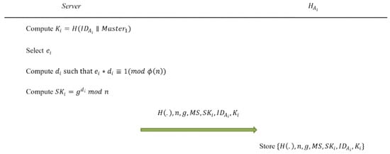 - Step 4: Server stores H(.), n, g, MS, SKi, and Ki in Ai’s authentication device .