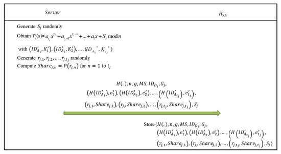 - Step 8: Server stores H(.), n, g, MS, , Gj, (H(), e1′), (H(), e2′), …, (H(), ), (rj,1, Sharej,1), (rj,2, Sharej,2), …, (, ) and Sj in the system administrator SA’s authentication device HSA, where j = 1, 2, …, w.