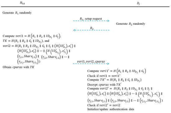 - Step 2: When Dj receives R1 and a setup request from HSA, Dj generates a random number R2. Then, Dj sends R2 back to HSA.