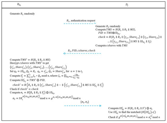 In the authentication phase, Dj sends R2, PID, cshares, and check to , where PID = TMS ⊕ , check = H(R1||R2||(rj,1, Sharej,1)||(rj,2, Sharej,2)||…||(, )||MS||||Sj), and cshares is the ciphertext of ((rj,1, Sharej,1), (rj,2, Sharej,2), …, (, )) with the encryption key TMS = H(R1||R2||MS). After receiving R2, PID, cshares and check, computes TMS′ = H(R1||R2||MS), decrypts cshares with TMS′ to retrieve (rj,1′, Sharej,1′), (rj,2′, Sharej,2′), …, (′, ′), and uses these shares and (, Ki) to obtain Sj′. Then, computes ′ = TMS′ ⊕ PID and check′ = H(R1||R2||(rj,1′, Sharej,1′)||(rj,2′, Sharej,2′)||…||(′, ′)||MS||′||Sj′) and checks whether check′ and check are equal or not. Because is concealed when it is transmitted and only Dj knows both and Sj, only Dj can compute check to be successfully authenticated by .