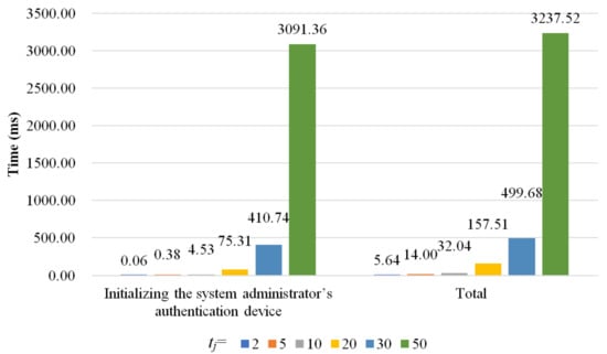 In the initialization phase, Server performs three tasks: (1) initializing the department’s authentication device Dj, (2) initializing the executive’s authentication device , and (3) initializing the system administrator’s authentication device HSA. In the first task, Server computes Gj = H(||Master2). The computational cost of this task is independent of tj, and it takes 0.00720 milliseconds. In the second task, the server computes Ki, di, and SKi for the executive’s authentication device . Similar to the first task, the computational cost of the second task is independent of tj, and initializing takes 3.09 milliseconds. Server computes for the system administrator’s authentication device HSA with the polynomial Pj(x) in the third task. There exists a positive correlation between the degree of the polynomial Pj(x) and tj. When tj increases, both the degree of the polynomial Pj(x) and time required to obtain the polynomial increase. Because tj varies and tj ∈{2, 5, 10, 20, 30, 50}, the computational costs for the third task are 0.0600 milliseconds, 0.384 milliseconds, 4.53 milliseconds, 75.31 milliseconds, 411 milliseconds, and 3090 milliseconds, respectively. To summarize, the total computational costs for the initialization phase with tj ∈{2, 5, 10, 20, 30, 50} are 5.64 milliseconds, 14.0 milliseconds, 32.0 milliseconds, 156 milliseconds, 500 milliseconds, and 3240 milliseconds, respectively.