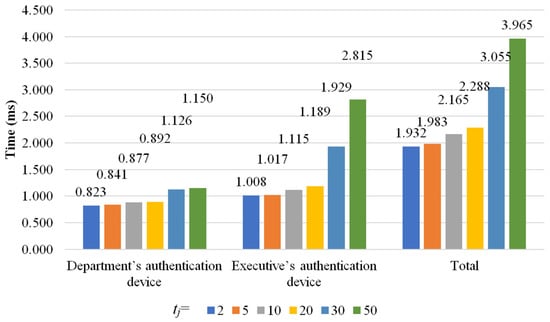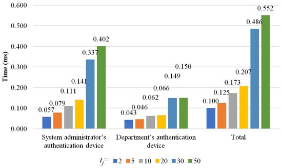 In the department authentication device setup phase, both the system administrator’s authentication device HSA and the department’s authentication device Dj are involved. HSA computes veri1 and veri2 and encrypts {Sj, (H(), e1′), (H(), e2′), …, (H(), ), (rj,1, Sharej,1), (rj,2, Sharej,2), …, (, )} to get cparas with AES, where veri2 is the hash value of (R1||R2||||Gj||Sj||(H(), e1′)||(H(), e2′)||…||(H(), )||(rj,1, Sharej,1)||(rj,2, Sharej,2)||…||(, )). Thus, when tj increases, the time needed for computing veri2 and obtaining cparas will increase. For tj ∈ {2, 5, 10, 20, 30, 50}, HSA spends 0.0573 milliseconds, 0.0787 milliseconds, 0.111 milliseconds, 0.141 milliseconds, 0.337 milliseconds, and 0.402 milliseconds on computations, respectively.